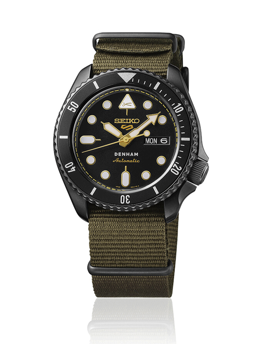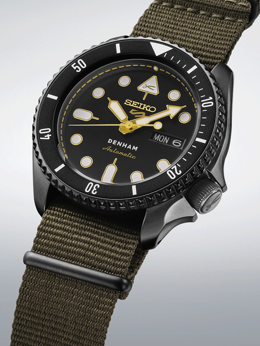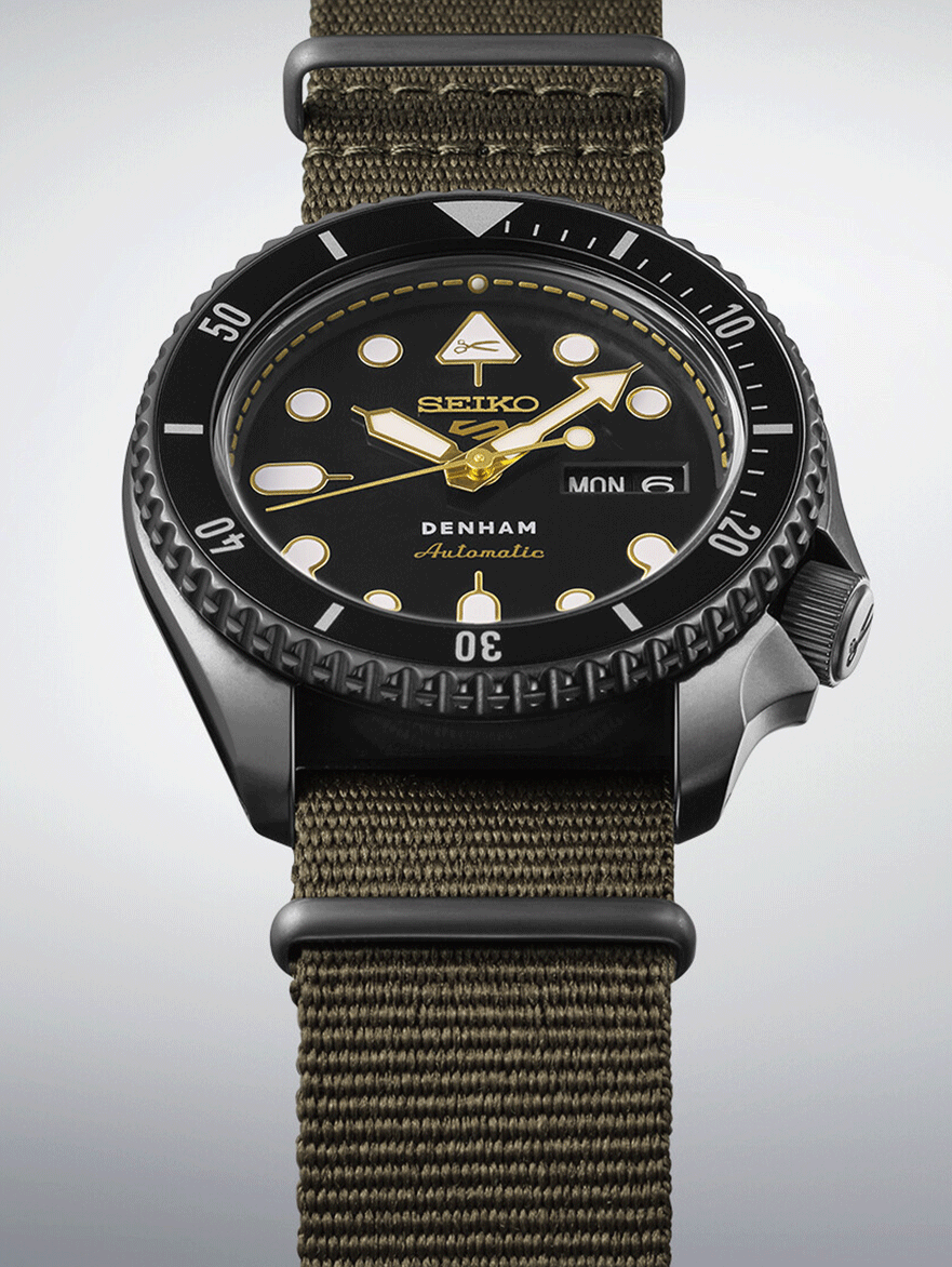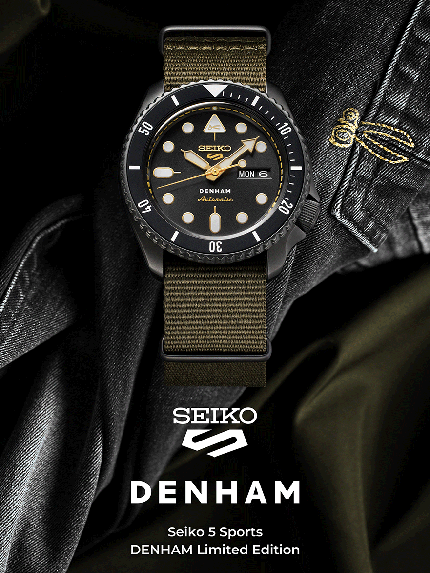 Seiko 5 Sports és a Denham kollab modelljének második kiadása, az SRPL37K1. A koncepció mit sem változott, ha egy egyedi hang a divat világából és a világ egyik legnagyobb óragyártója összefog, abból csak siker lehet, újra. Jason Denham, a cége névadója már 2008 óta készíti saját, egyedi darabjait a “blue jeans”, vagy ahogy mi ismerjük a farmerek világában. Jason Denham jelszava a “Truth is in the details”, vagyis az “Az igazság a részletekben rejlik” A Denham szlogenje akár a Seiko óráira is értelmezhető, hiszen ahogy a minőségi farmereknél, úgy a Seiko óráinál is sokszor a fontos dolgok olyan részletekben bújnak meg, amelyeket a mindennapokban nem is láthatunk, de tudjuk, hogy ott vannak bent a szerkezetekben, kifinomult műszaki megoldásokban. A színösszeállítás kicsit a military stílus felé kacsingat, a sötétszürke bevonatos tokban fekete a számlap és az SKX tokformával járó lünetta betétje is, míg maga az ikonikus formájú tok, a korona és a lünetta is egységesen “gunmetal”, vagyis fegyverszürke színben játszik, ahogy a katonai zöld színű szövet szíj csatja és bújtatói is.A fekete és szürke szigorú egységét arany színű részletek törik meg, a jellegzetes formájú indexek és mutatók arannyal keretezik a Lumibrite fehér színű festést, amely hosszan foszforeszkál a sötétben.Az arany részletek feltűnnek még a fejre fordított 12-es indexben is, ahol a Denham olló logóját találjuk, de arany színű a Seiko 5 Sports logó és az “Automatic” felirat is, amely hat óránál, a Denham logó alatt kapott helyet. A Denham kollab modellek egyik jellegzetes eleme a számlapgyűrű arany színű “varrása”, amely körülöleli a számlapot, és persze a farmerek díszítésére utal. A logó számtalan helyen tűnik még fel, megtaláljuk a koronában és az üveg hátlapon, ahol a farmermárka szlogenje, a “Truth is in the details” is - talán éppen azért, mert ez az üveglap rejti a fontos részleteket odabent. A limitált kiadású modell mindössze 2000 darabban készült és Boutique Exkluzív modell és saját díszdobozt is kapott.